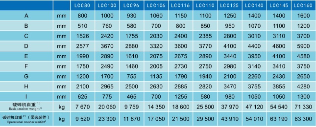 以上數(shù)據(jù)所表示的破碎機(jī)產(chǎn)量,是針對(duì)平均比重為 2.7t/m 3 ,給料能夠順利進(jìn)入破碎腔、無(wú)架橋卡堵現(xiàn)象,給料剔除小于排礦口細(xì)料時(shí)取小值,含細(xì)料時(shí)取大值。產(chǎn)量可能隨給料方式和物料性質(zhì)諸如粒度組成、含水含泥量、松散密度和可碎性而變化。